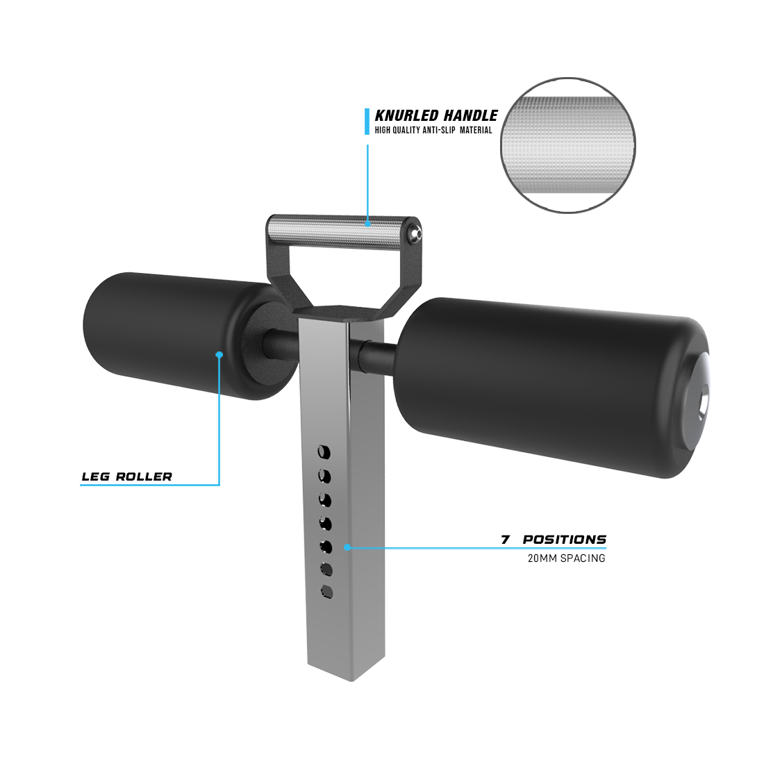 The RX3 Optimus Roller provides comfortable support for lat pulldowns by securing your legs to the RX3 Optimus Pad, ensuring stability during every workout. Featuring two dense, grippy nylon-covered rollers (4″ diameter each), also featuring a 5” knurled handle that provides a firm, textured surface for easy handling during height adjustments to secure down your legs. This attachment adjusts via a telescoping system with the seat’s quick-adjust pop-pin, offering 7 vertical positions (0.75″ spacing) to fit any user. Measuring 22″ in width and 15″ in height, it integrates seamlessly into your setup. Finished with a durable black powder coat and chrome tube, this roller enhances your RX3 Optimus Pad for a secure lat pulldown option.