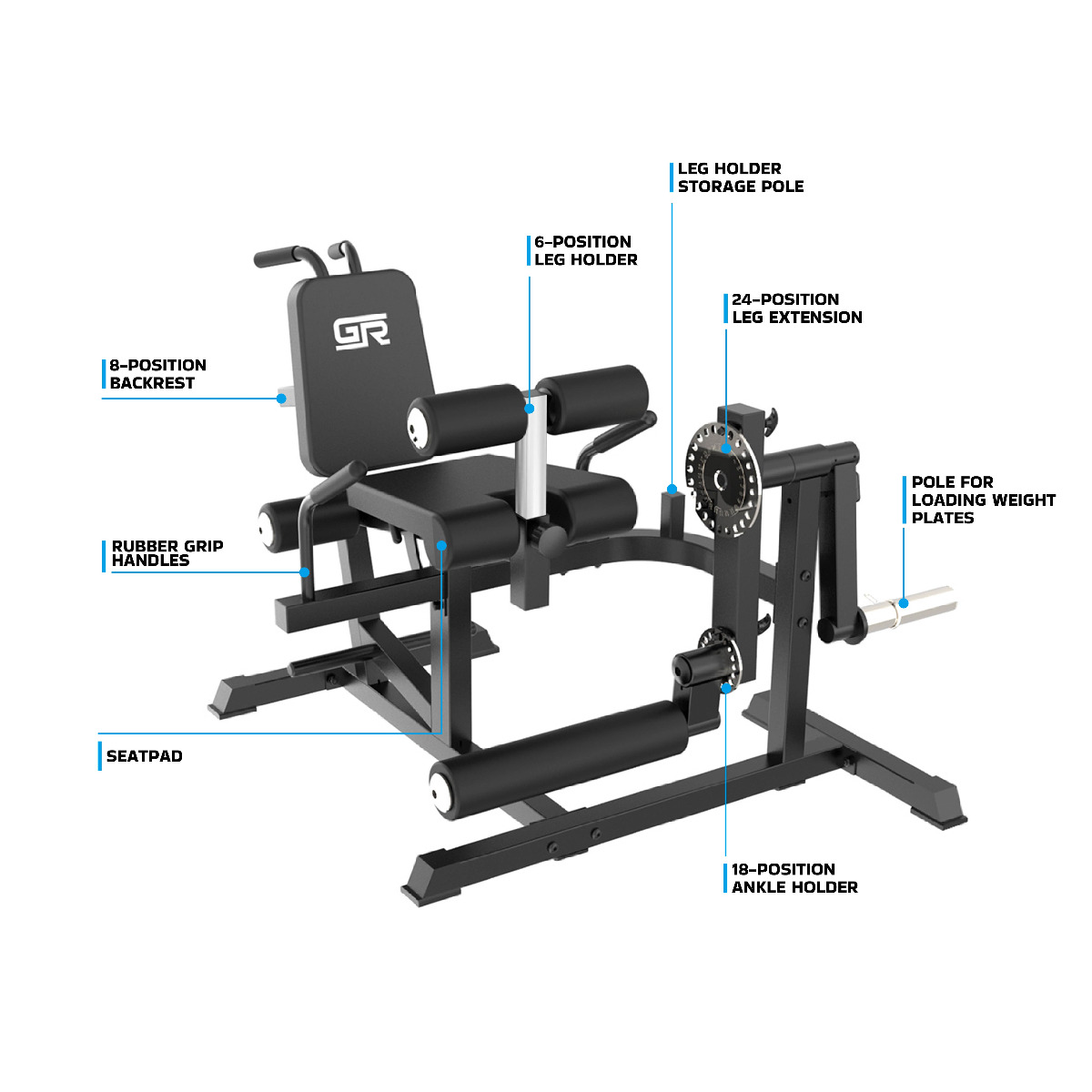 - 6-Position Leg Holder for seated leg curls, removable for lying leg curls, calf raises, back extensions, and ab